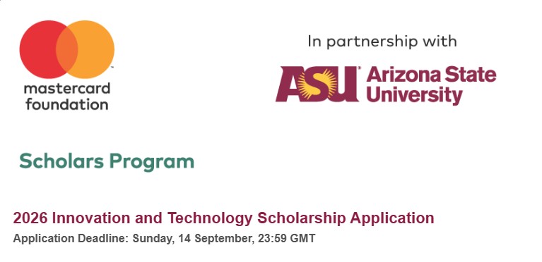 The Mastercard Foundation, in partnership with Arizona State University (ASU), offers a fully-funded master’s scholarship program aimed at training 120 young African professionals in technology and sustainable innovation over 5 years.