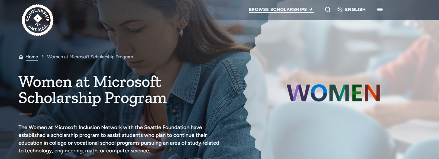 The Women at Microsoft Scholarship Program is a merit-based scholarship created by the Women at Microsoft Inclusion Network in partnership with the Seattle Foundation. The program supports female students planning to pursue undergraduate studies in technology, engineering, mathematics, or computer science. Selected students receive a $5,000 one-time scholarship to study at an accredited U.S. college, university, or vocational institution.